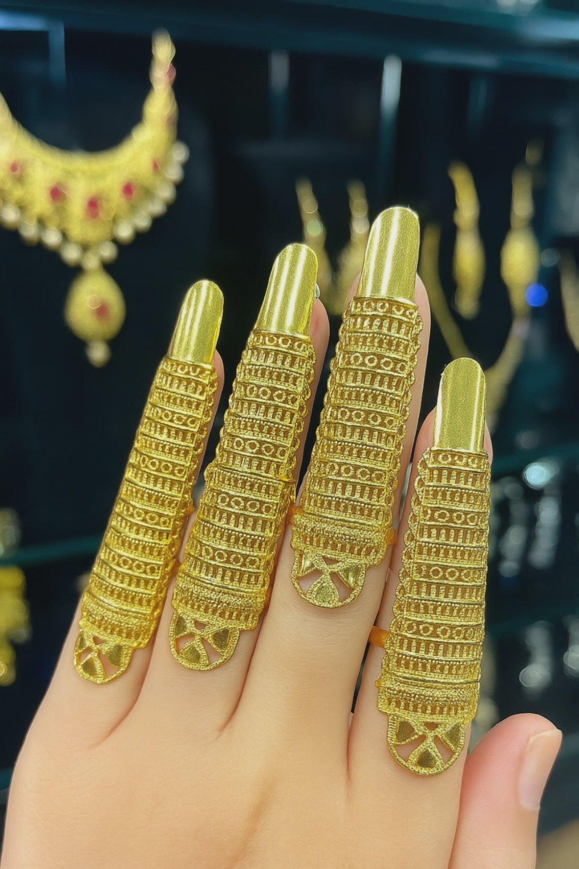 Shop the stylish Full Finger Ring Set in gold color! Perfect for weddings, parties, and cultural events. Lightweight, adjustable, and designed to give your hands a royal, elegant look