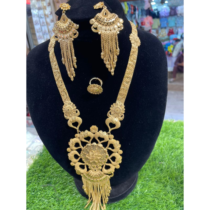 Make a bold and elegant statement on your special day with this intricately crafted Traditional Gold-Plated Bridal Jewelry Set. This stunning set includes a grand pendant necklace, a pair of long chandelier-style earrings, and a matching floral ring — all designed to reflect the rich heritage and beauty of traditional craftsmanship.
